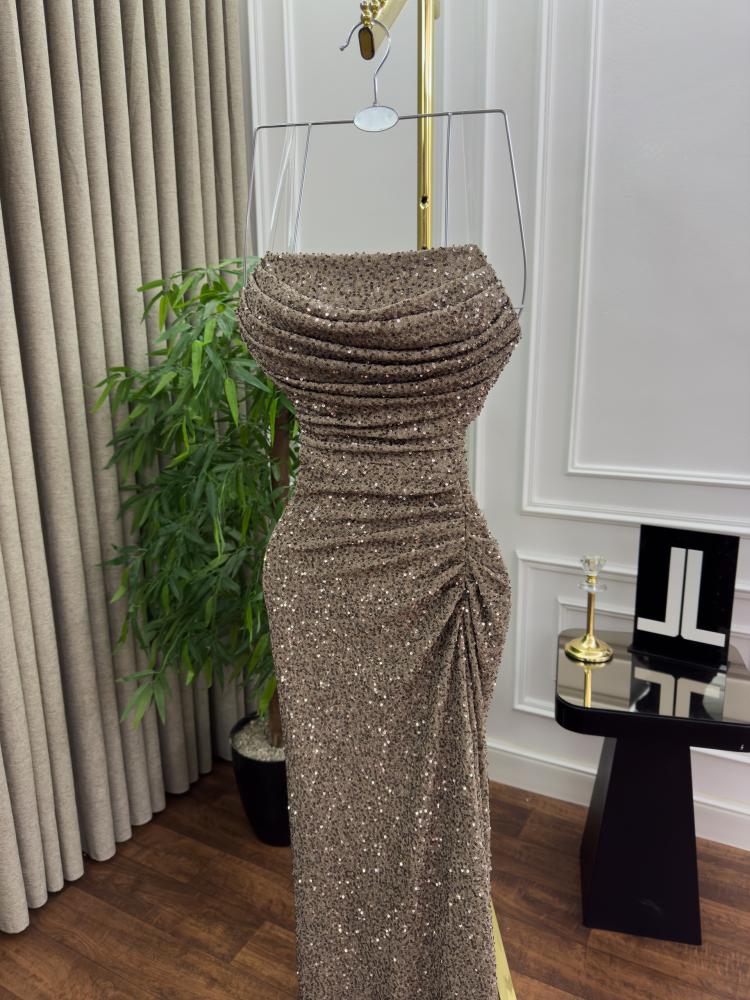 🎀 وصف التصميمالتصميم يبدأ من صدر مطرّز بطيات متدرجة تعطي عمق وأناقة ملكية، ويكمل بانسدال ترتر لامع على طول القماش. القصة الجانبية عند الخصر تجي بنحت ذكي يبرز القوام، ويمنح الفستان حركة منحوتة تعكس توازن القوة والأنوثة.
