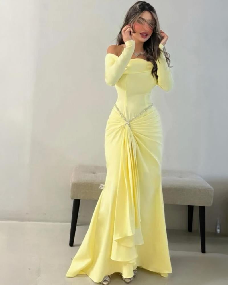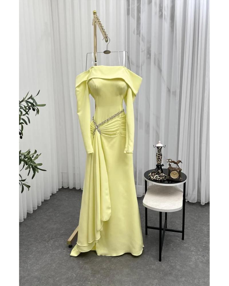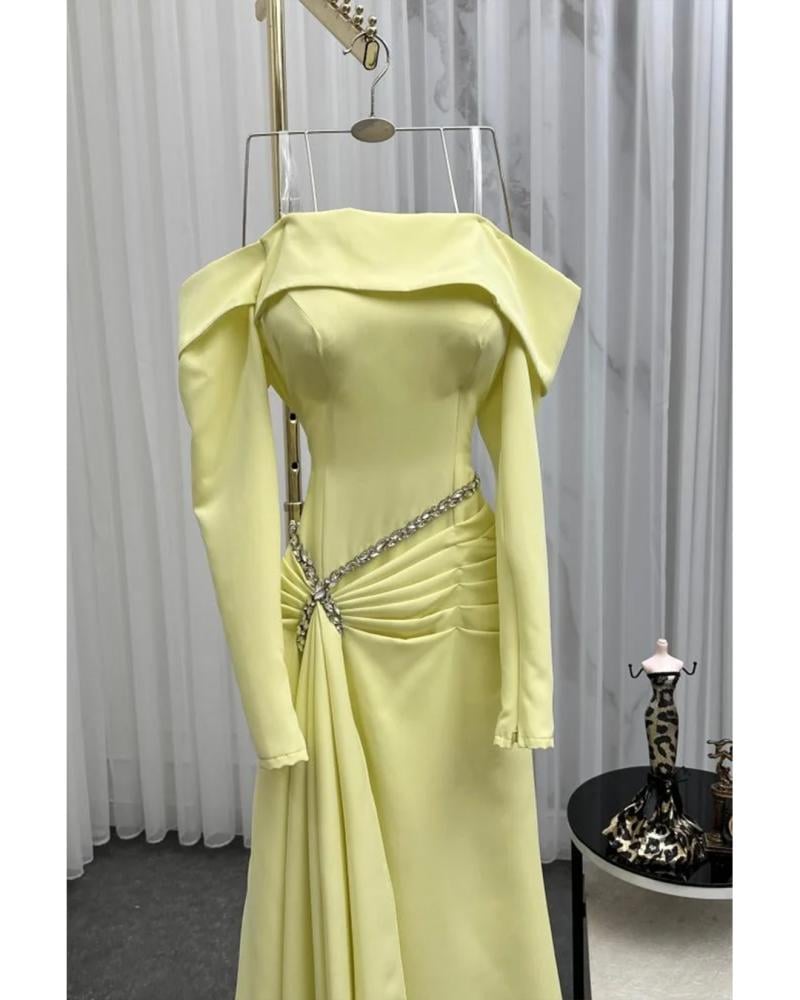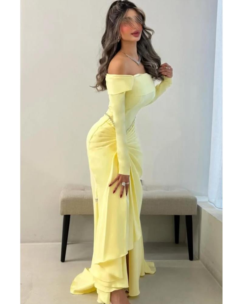 فستان يتميز بتصميم أنيق وأنثوية اللون: أصفر فاتح باكمام طويلة وضيقة مع كتفين مكشوفين ، يزين الخصر سلسلة من الكريستال أو الترتر اللامع على شكل V مقلوبة، تنسدل منها طيات قماش ناعمة في المنتصف،