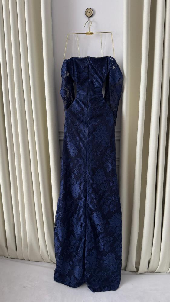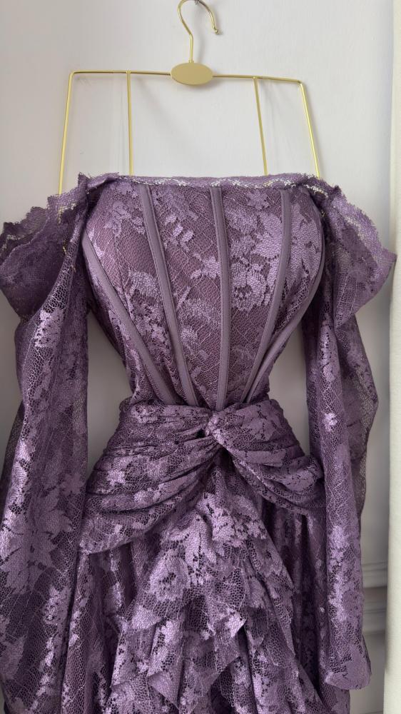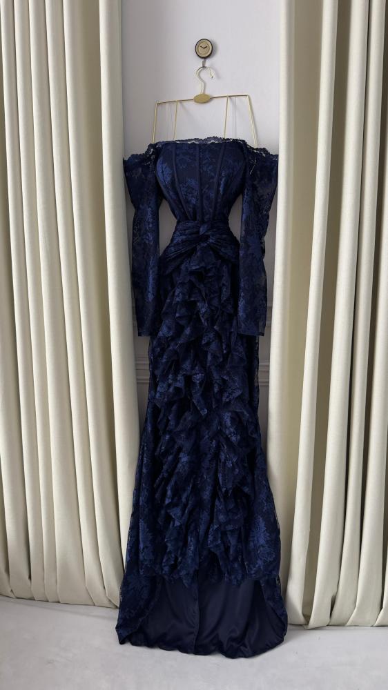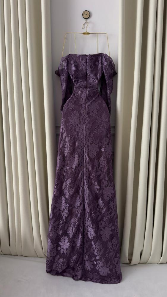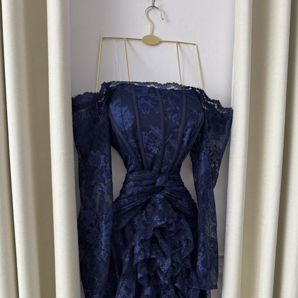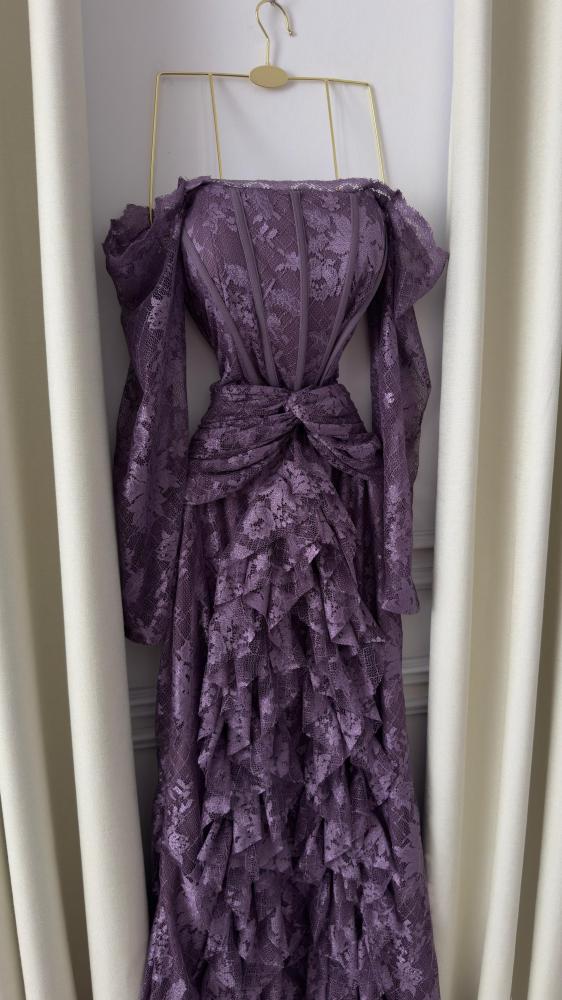 🎀 وصف التصميمقصّة أوف شولدر (Off-Shoulder) مع أكمام دانتيل تنسدل بخفة، تعكس لمسة أنثوية راقية. الصدر المشدود يُبرز القوام، بينما تنساب الطبقات المتدرجة من الدانتيل بنعومة لتمنح الفستان إطلالة درامية راقية.