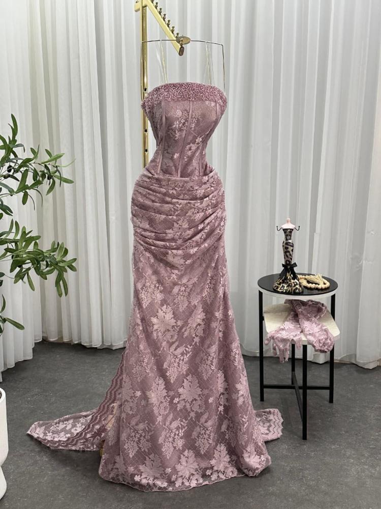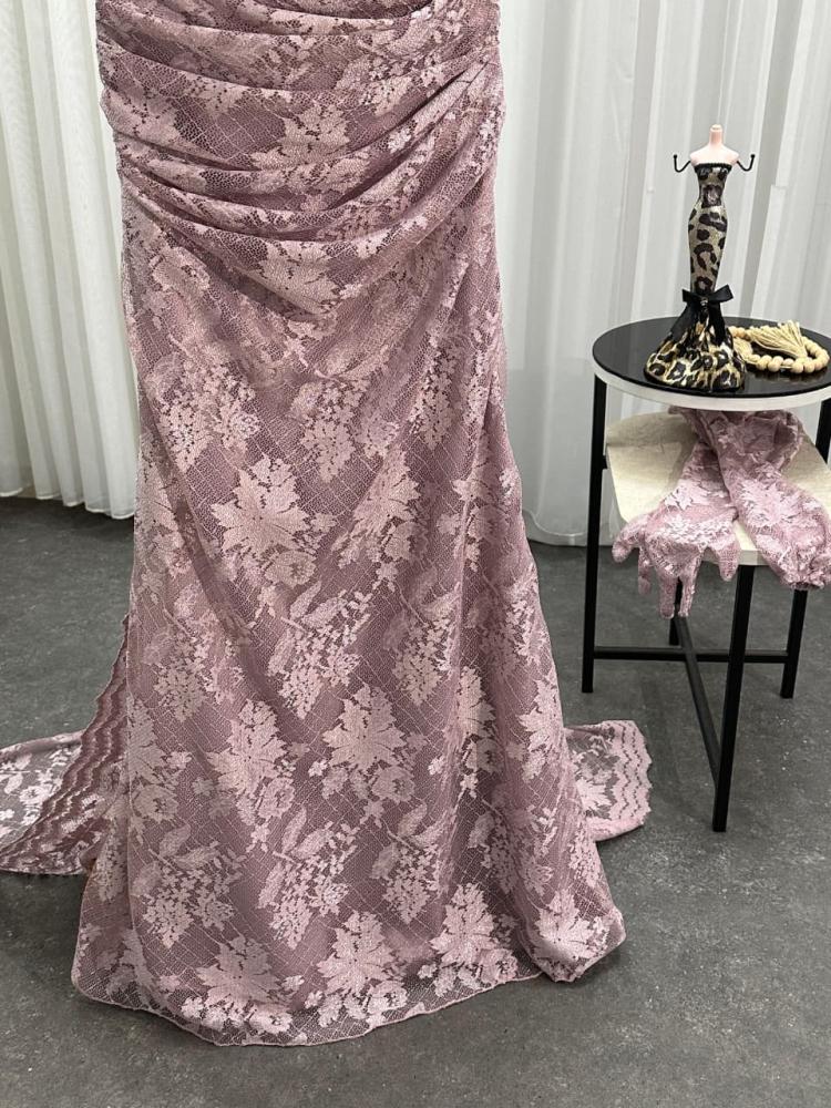 فستان بدرجات الموف الناعمة، مصنوع من دانتيل فاخر مطرّز يدوي بلمعة أنثوية راقية. التصميم يبرز القوام بأسلوب مميّز من خلال كورسيه ضابط للشكل، مع تنورة تنسدل بنعومة وتكملها لمسات الكسرات الجانبية التي تضيف عمق وأناقة للتفاصيل. البطانة من قماش تفته سترتش فاخر، تمنحك راحة وحركة بدون ما تخسرين اللمسة الفخمة.