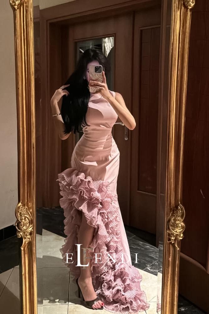 تصميم فريد ومبهر: يتميز الفستان بتصميم الكشكش الجانبي الذي يضيف حركة ساحرة وأناقة لا تقاوم.