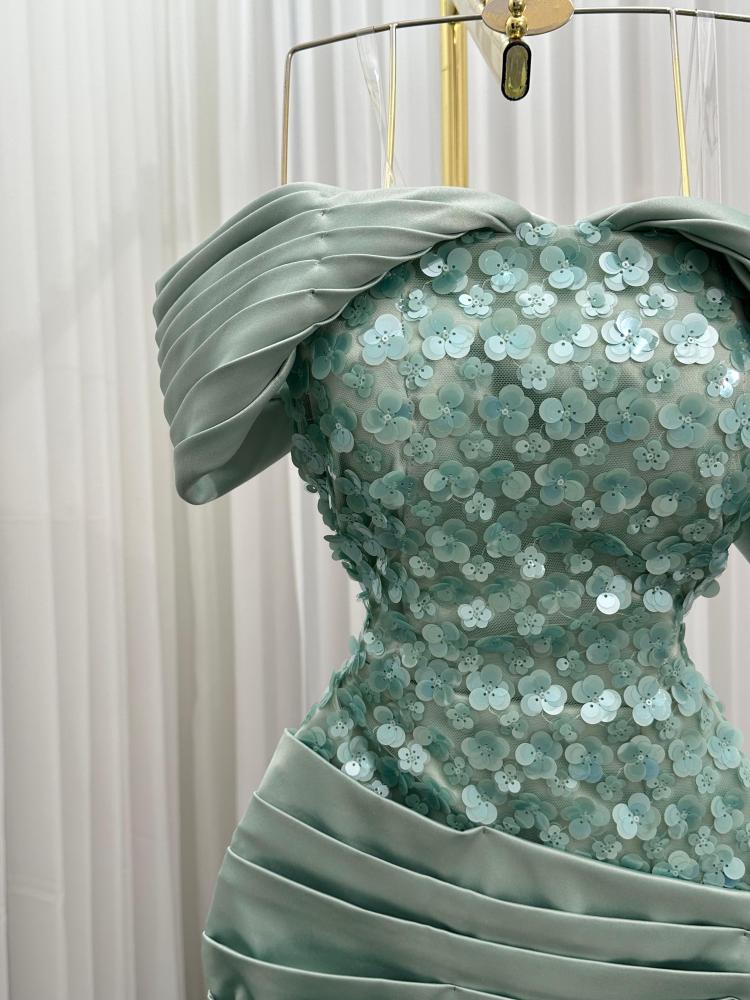الجزء العلوي مصمَّم بكلفة دائرية لامعة مرتبة بعناية على خامة تفتة سترتش تحتضن الجسم بشكل ناعم، مع أكتاف مُجعدة تعطي حضور غير تقليدي.