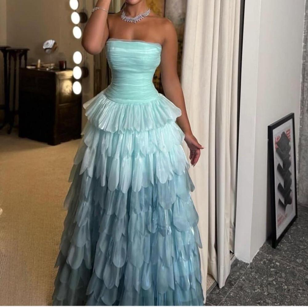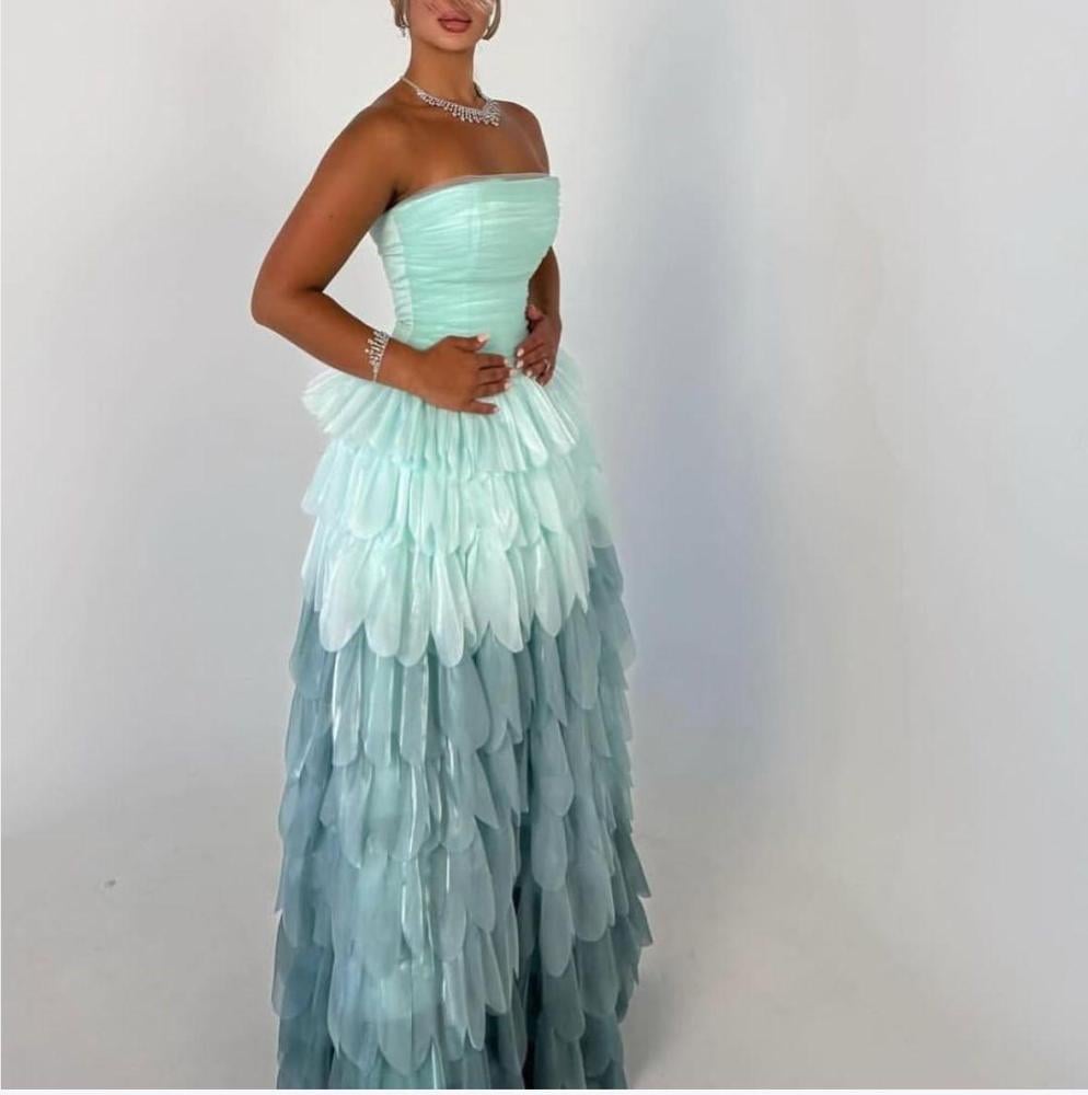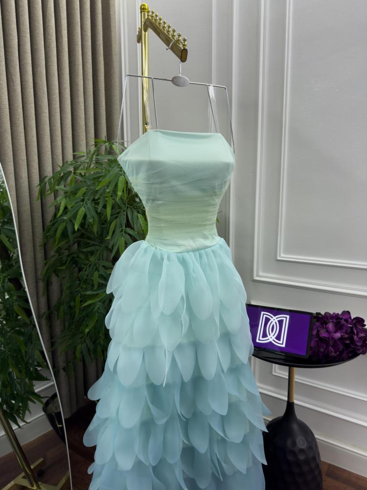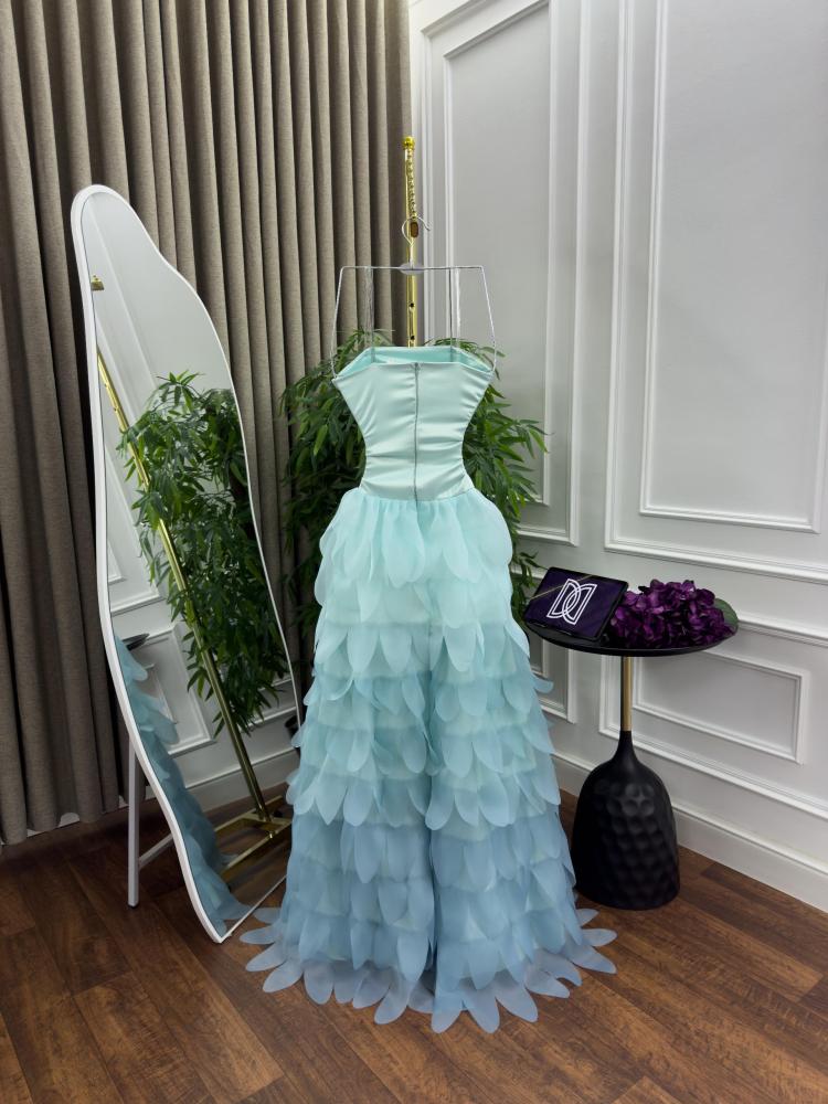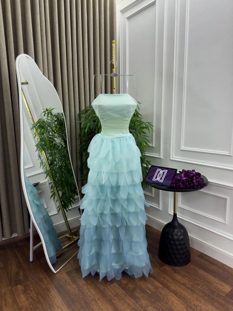صدر الفستان المصمم بلمسة مرتبة يبرز جمال القوام، بينما الطبقات الثلاثية المتداخلة بدرجات الأزرق الفاتح تضيف عمقًا وأناقة استثنائية.