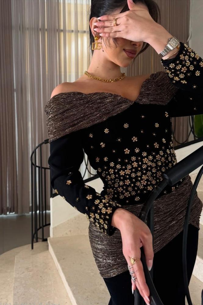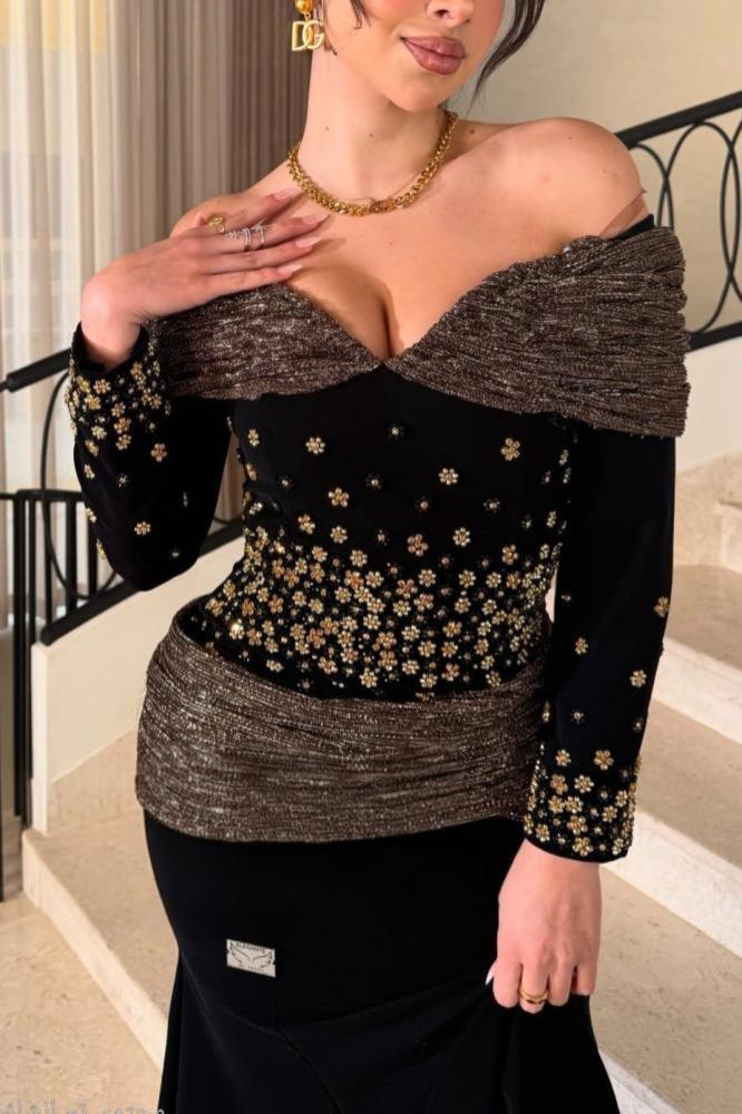 قصّته أوف شولدر تبرز الأكتاف بأنوثة راقية، والتطريزات الذهبية الصغيرة تعطي لمعة ناعمة كأنك لابسة نجوم الليل على بشرتك. الجزء العلوي مشغول بخامة لمّاعة تلف الخصر وتفصّل الجسم بأناقة، تنتهي بتنورة سوداء فخمة تنسدل بهدوء وتخلي حضورك لا يُنسى.