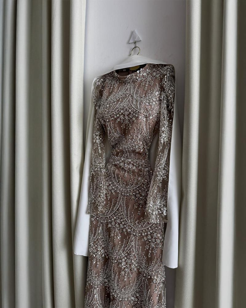 لون الفستان يجمع بين هدوء التدرجات الترابية ولمعة الخرز الفضي،