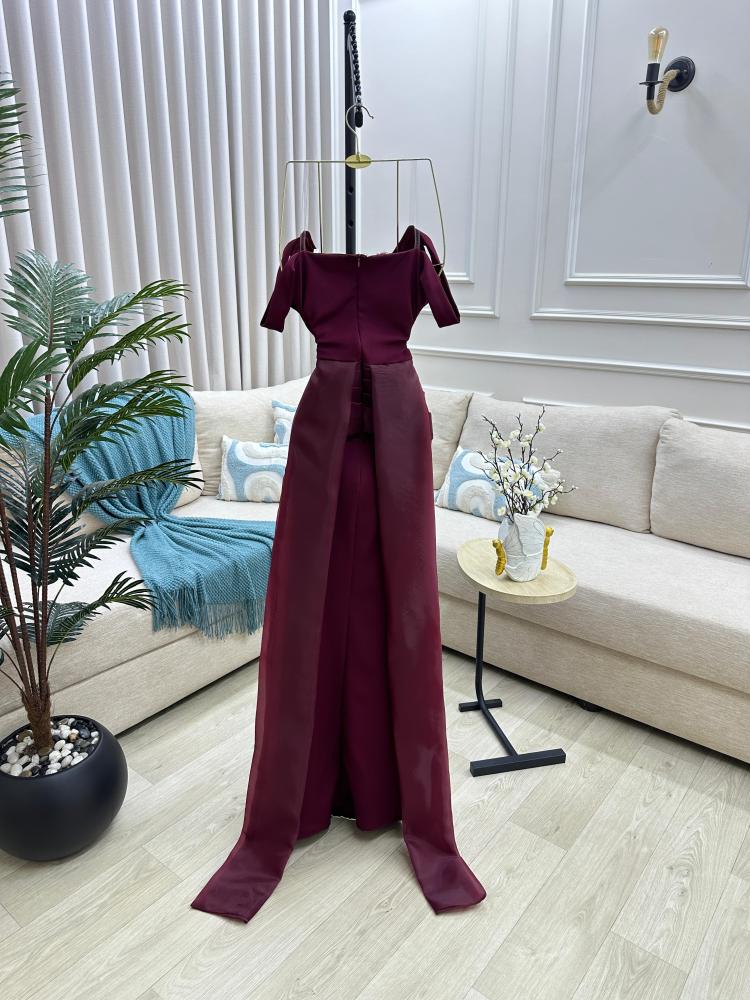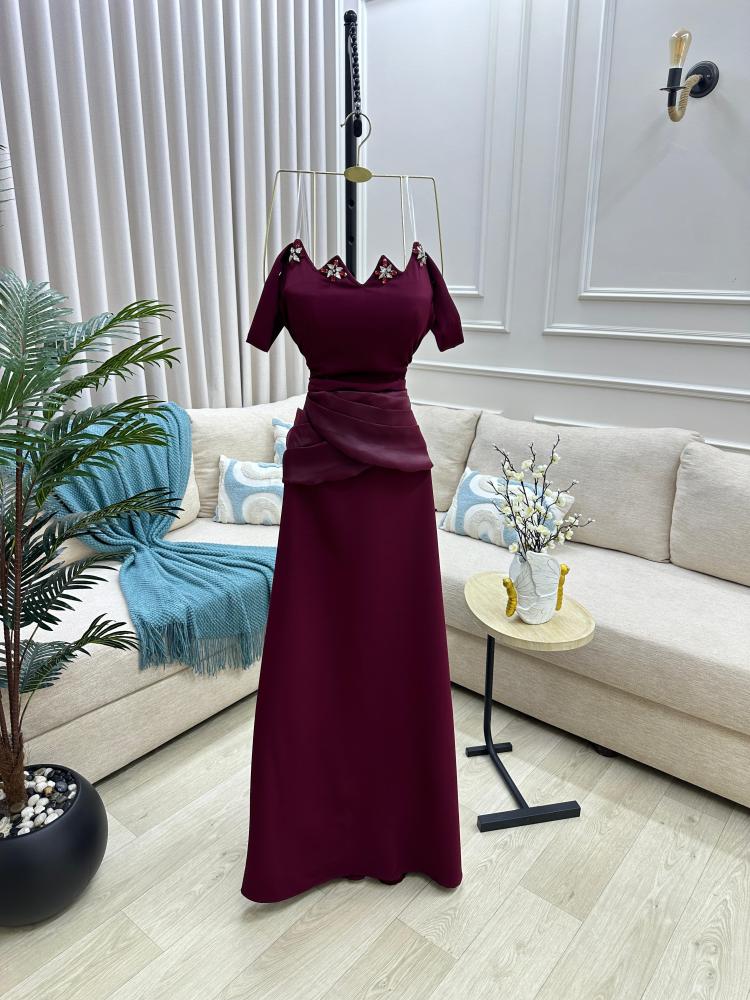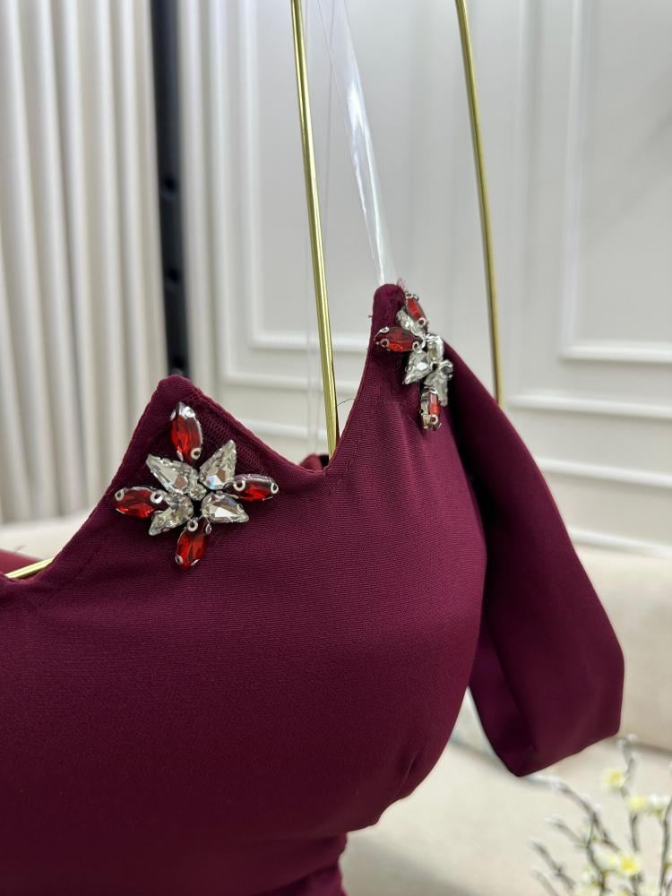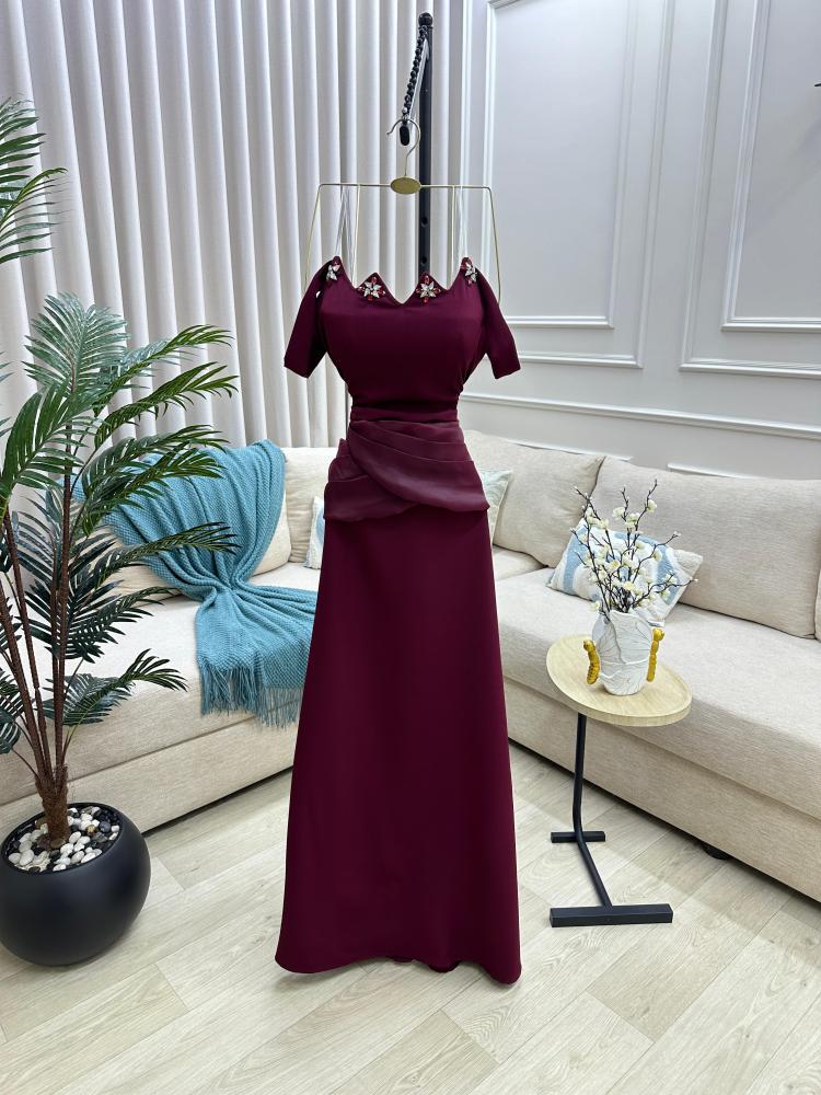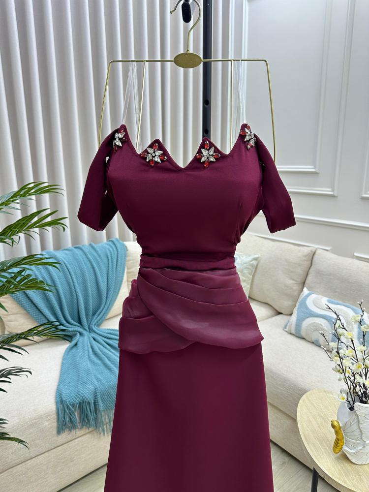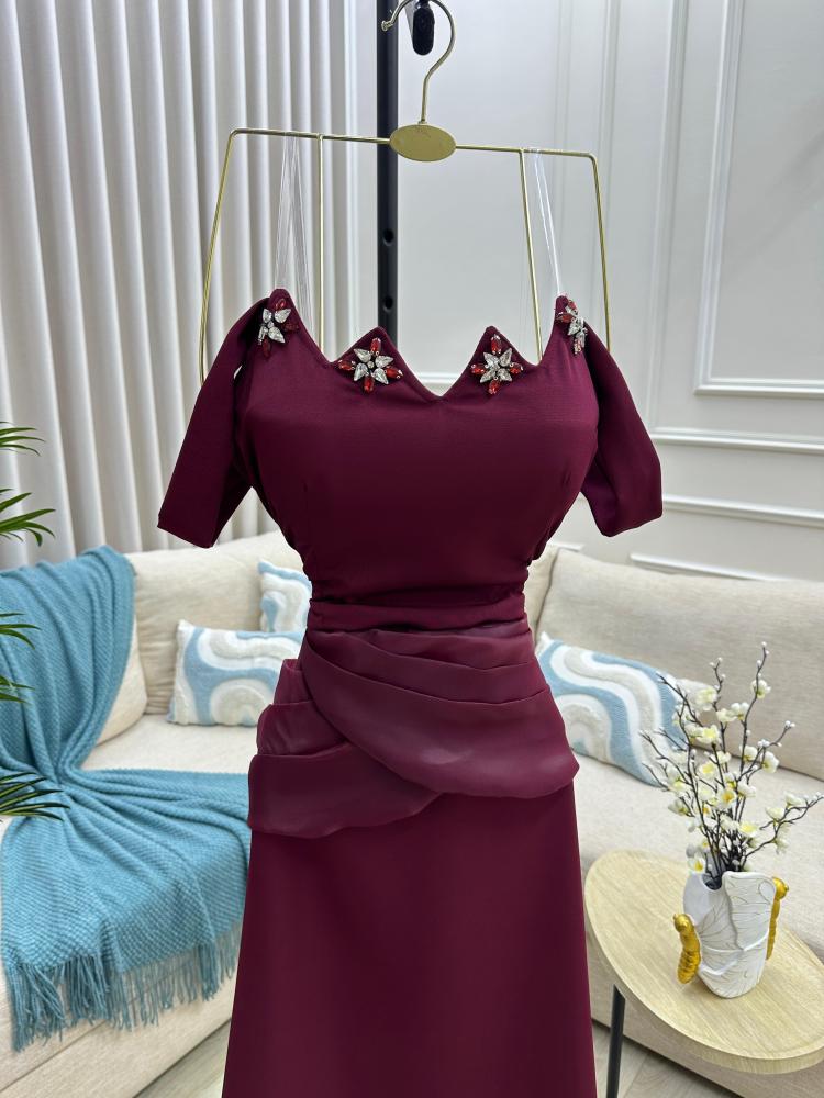 إطلالتك من إيلفندي تبدأ مع نوڤيا، فستان سهرة ناعم بلون عنابي مخملي، يغمرك بإحساس فخم من أول نظرة.