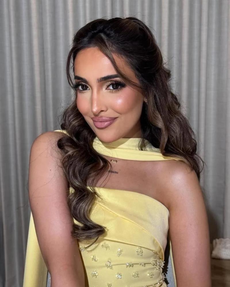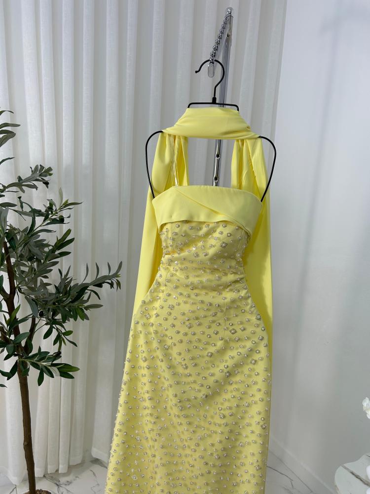 فستان يتميز بتصميم أنيق من قطعتين بلون أصفر فاتح . يتميز الفستان بشال مع طيات خفيفة تضيف حركة وانسيابية. ضيقة تنسدل بشكل مستقيم حتى الأرض.