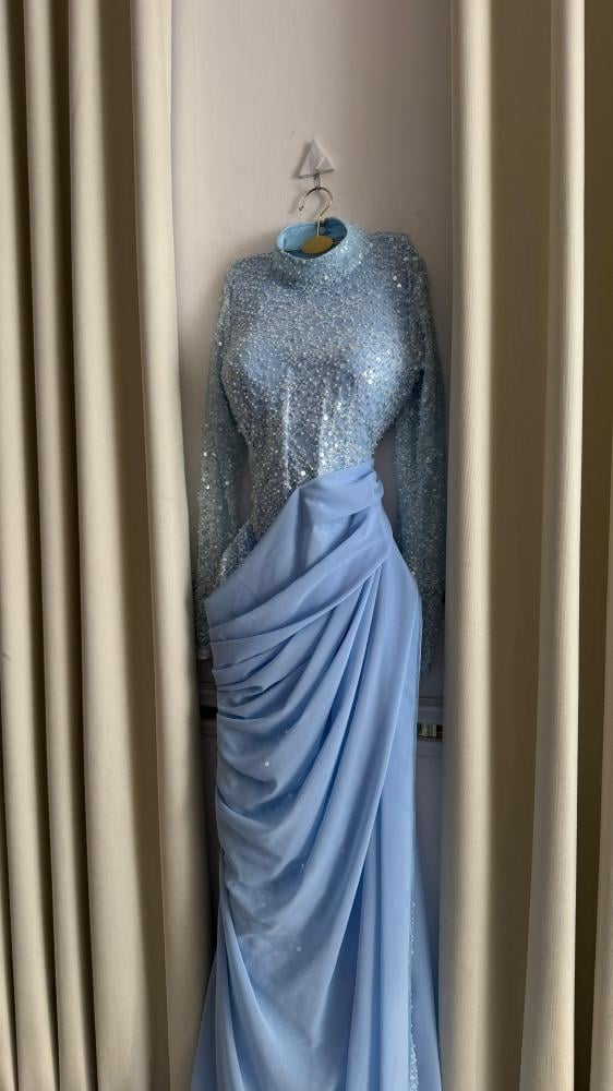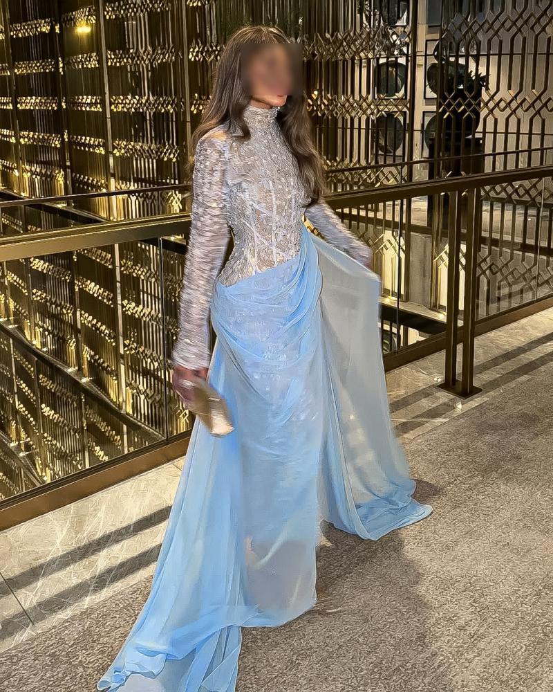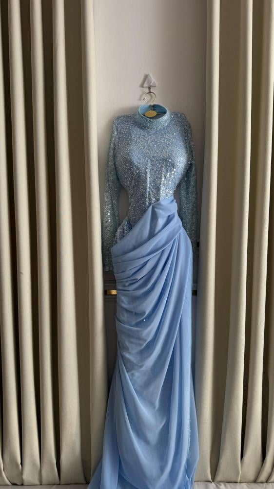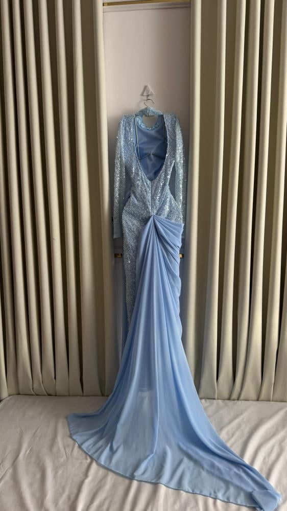 فستان أزورين صُمم بلون سماوي راقٍ يبرز الملامح بنعومة فخمة.