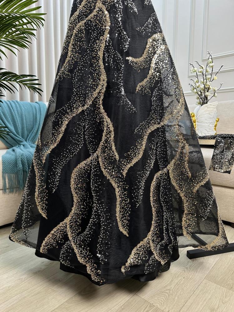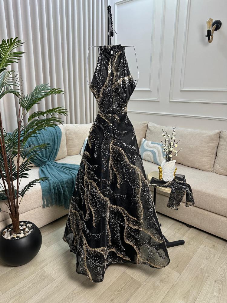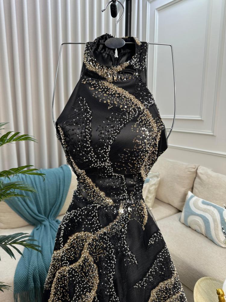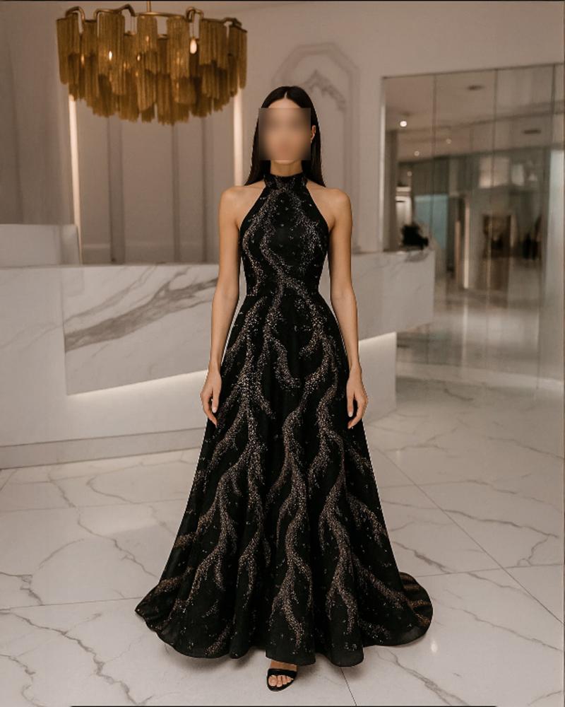 هالتر برقبة مرتفعة وقصّة محدِّدة للخصر مع تنورة واسعة تعطي حضورًا ملكيًا. سطح الفستان مزخرف بنمط لامع متدرّج يشبه أمواجًا ذهبية على قاعدة سوداء أنيقة—إطلالة تخطف النظر من أول خطوة.