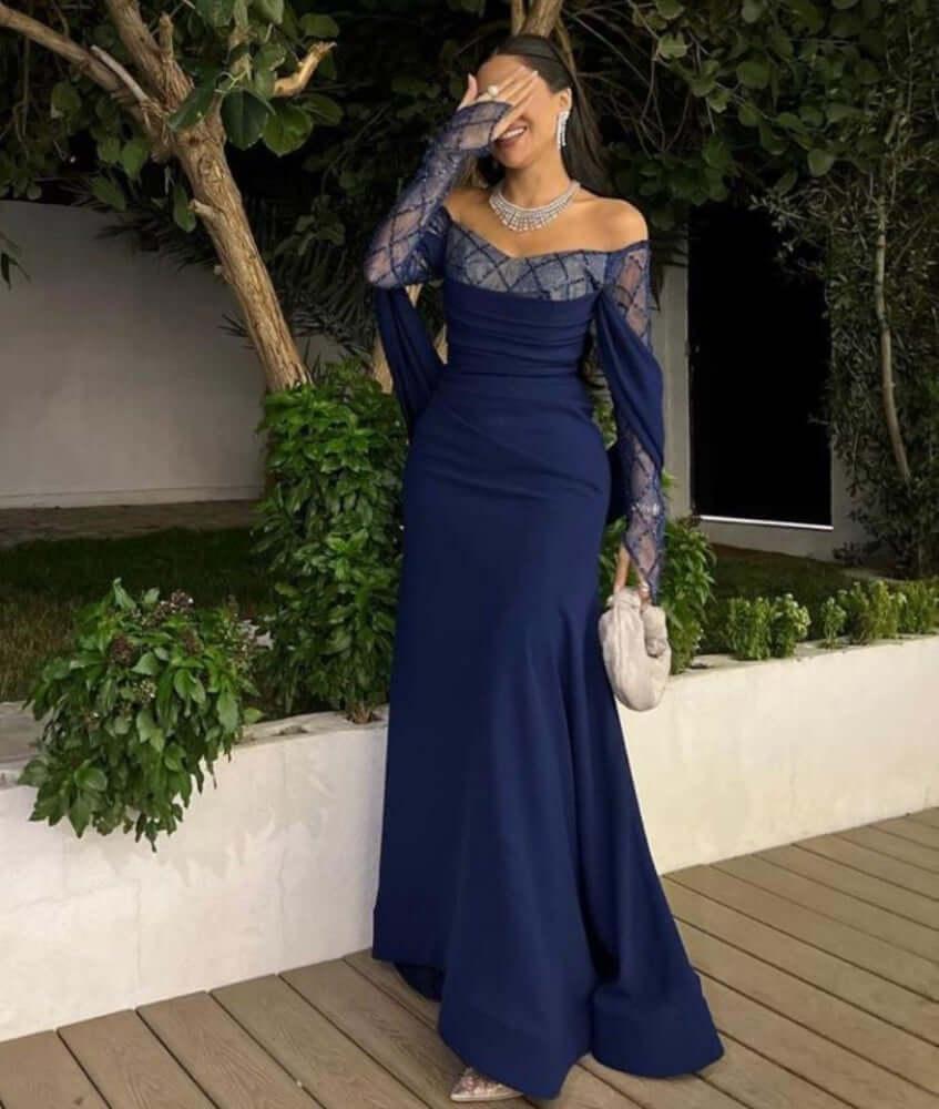 أكتاف أوف شولدر تزيدك دلع، مع كمّات دانتيل شفافة تلمع بهدوء وكأنك تلبسين القمر على كتوفك.