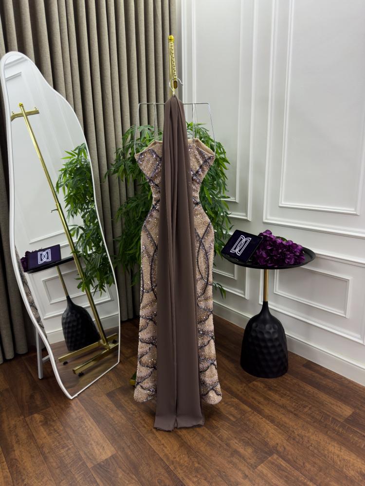 الفستان يجمع بين التطريز اليدوي الفاخر والكلف اللامعة مع خامة الخرز المتناثرة كنجوم الليل، ينساب على الجسم بخطوط أنثوية، وتكمله لمسة الشال الشيفون التي تزيده سحرًا وأناقة.