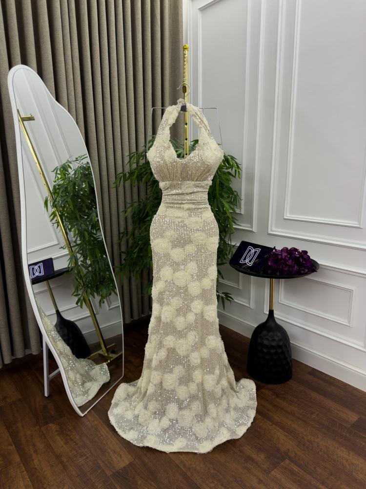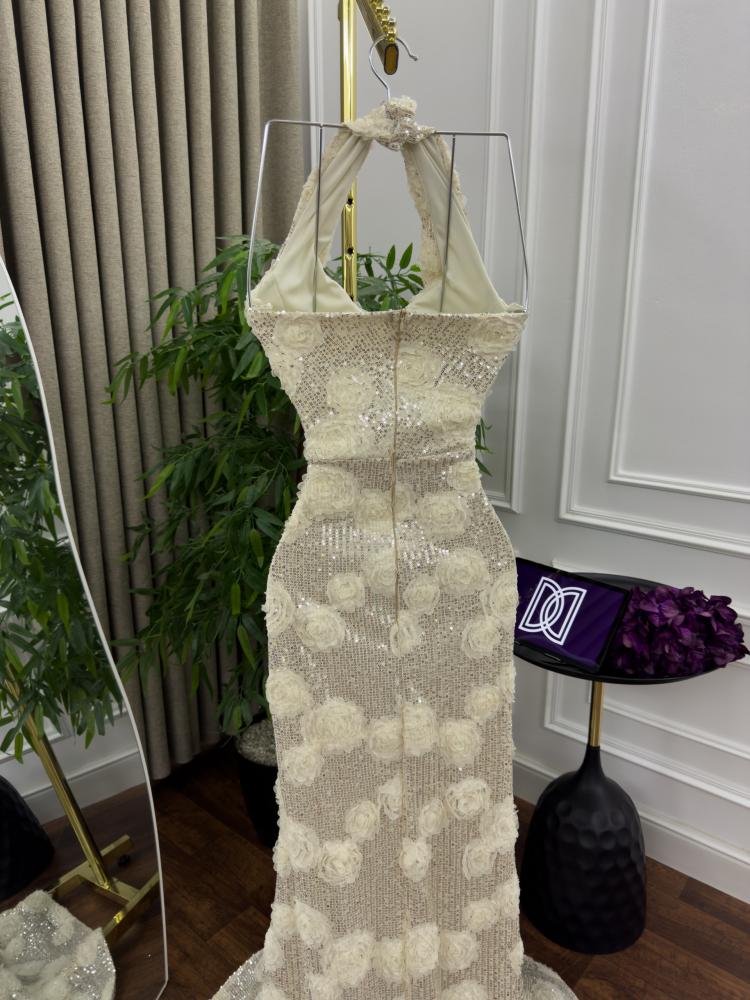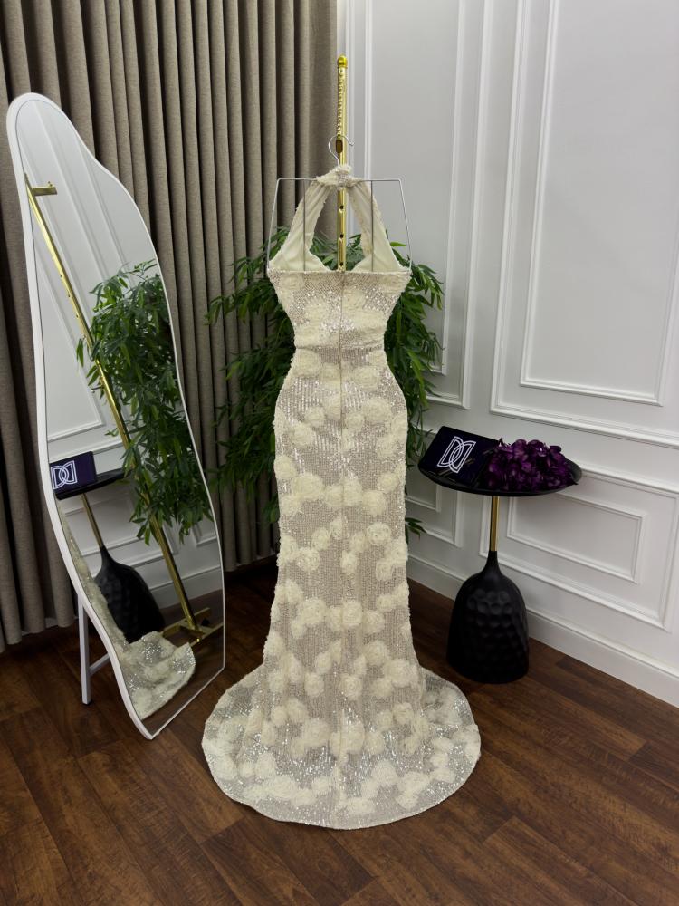 اللون: أوف وايت مزين بتطريز ترتر وورود ناعمة
