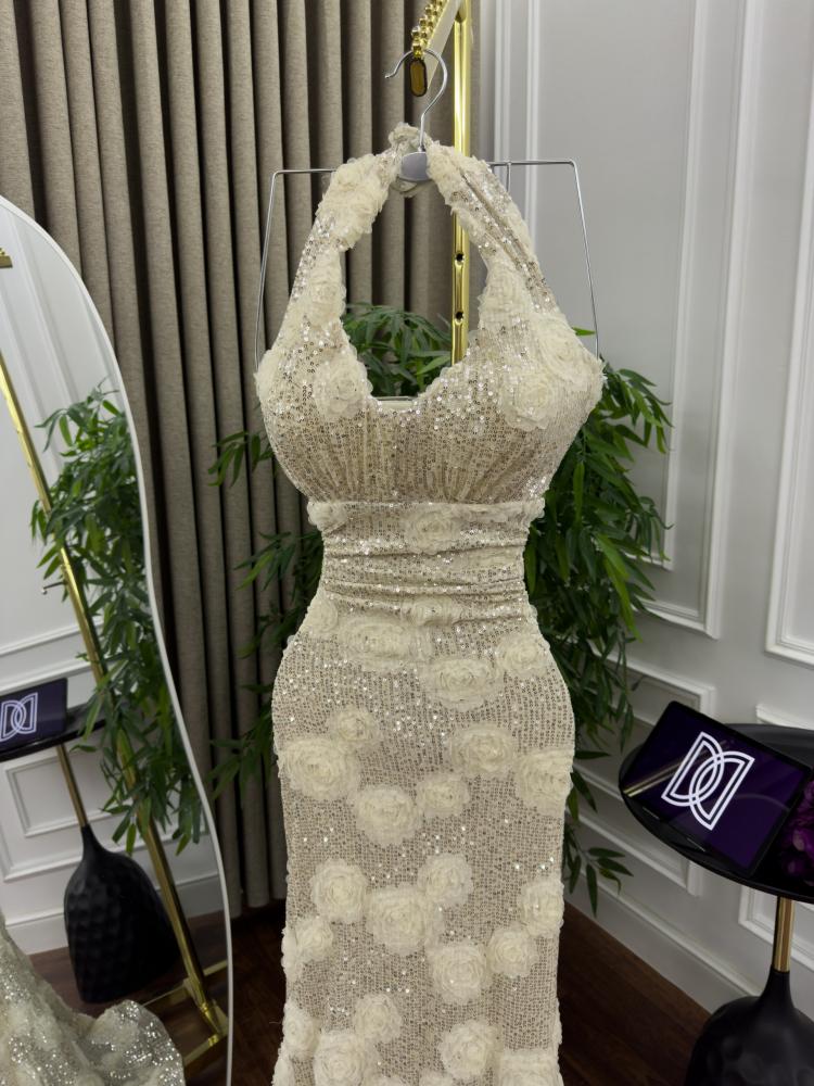 التطريز اللي يغطي كامل الفستان يعطيه إضاءة ناعمة تخطف حتى بأبسط حركة. والموديل الضيق اللي يبرز الخصر ثم ينزل بانسيابية، يضيف حضور ملكي بدون أي مجهود.