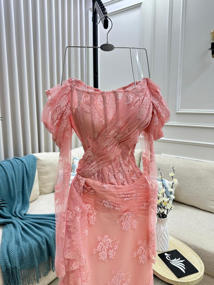 أكتاف منسدلة بلطف مع قصّة كورسية متقاطعة تشد الخصر وتبرز التناسق،