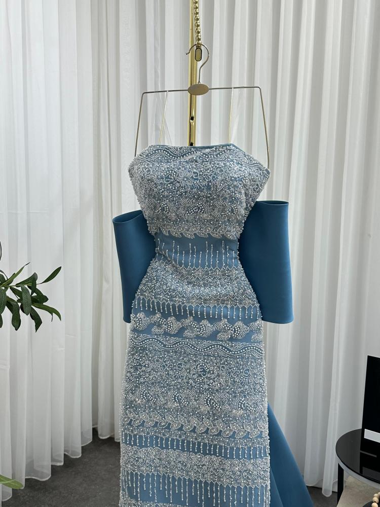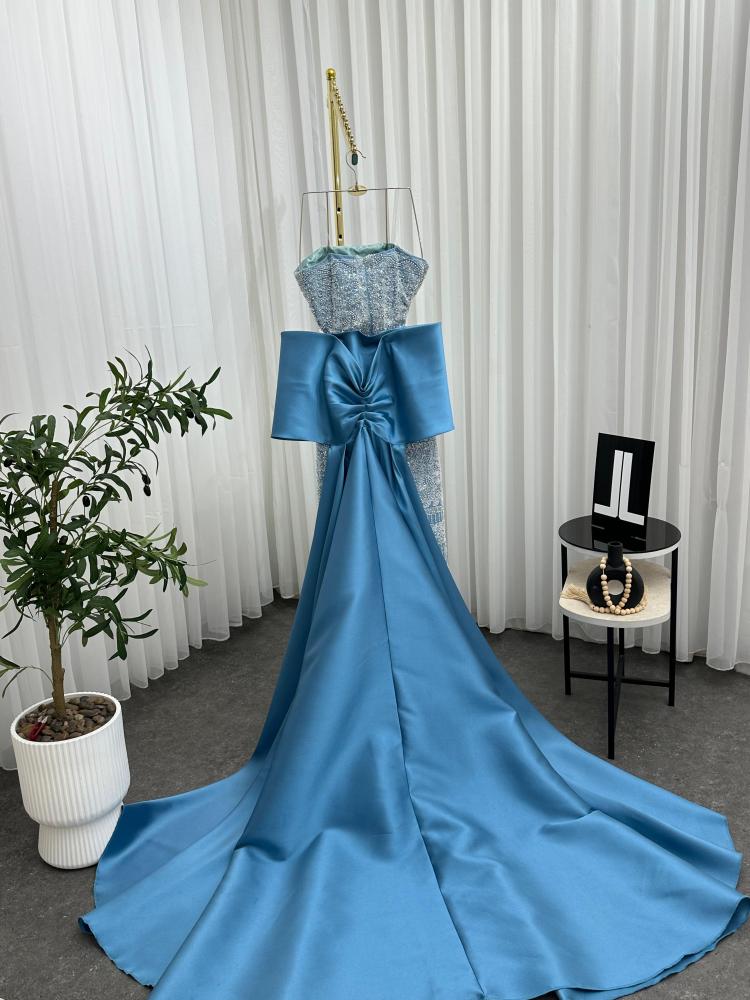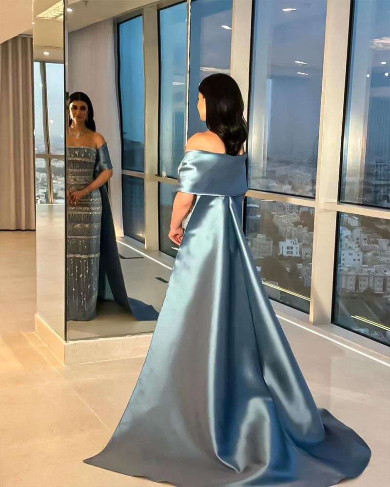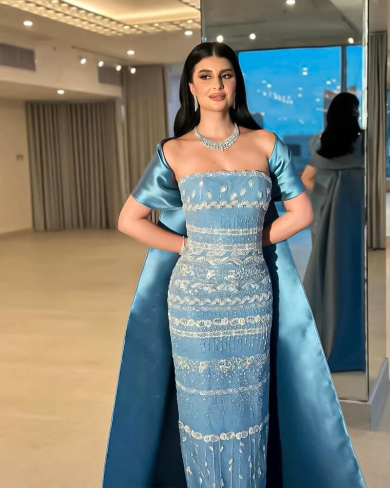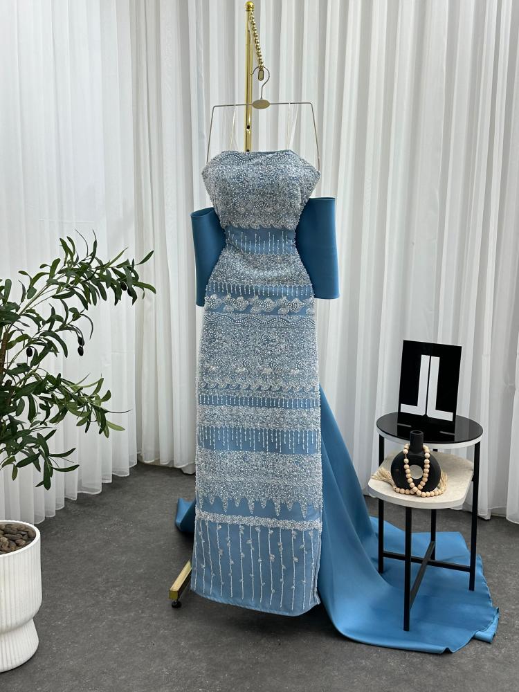 👗 عن التصميم: فستان أزرق سماوي أنيق يجمع بين فخامة الميكادو ولمسات الكلفة المطرزة بالخرز اللامع، مع قصّة عمودية انسيابية وذيل طويل ينساب برقي خلفك، تمنحك حضور ملكي يخطف الأنظار. التصميم مزوّد بكمّين جانبيين عريضين بأسلوب عصري يضيف لمسة درامية متفرّدة.