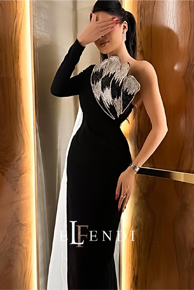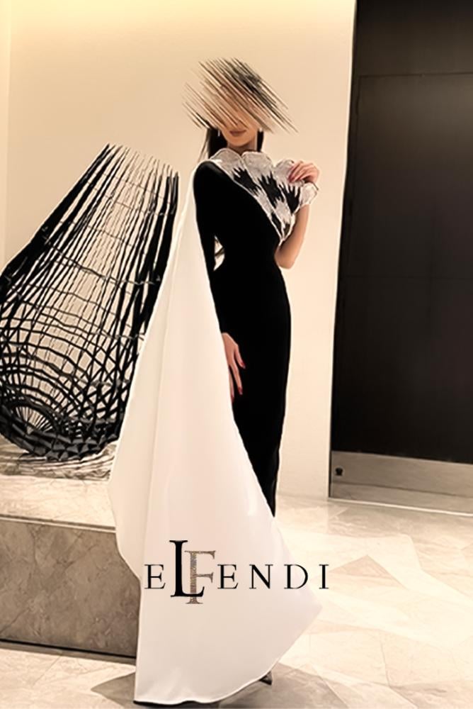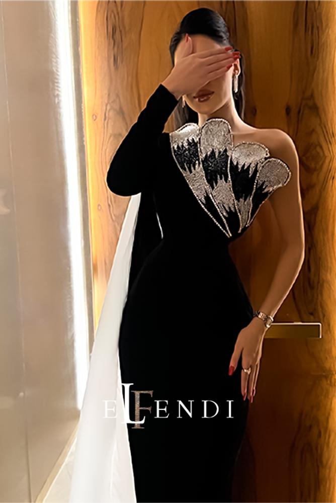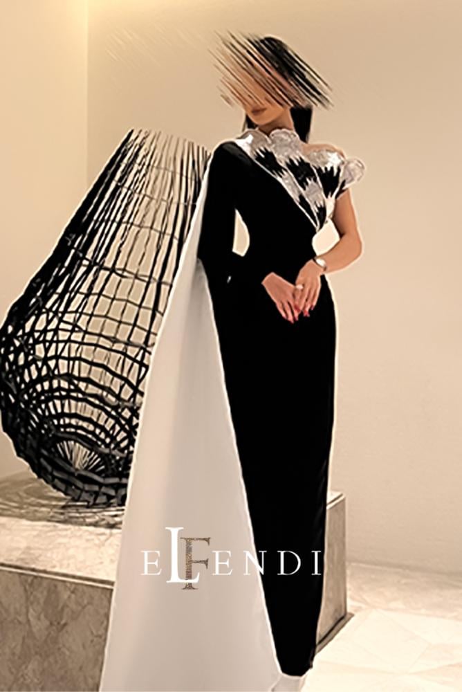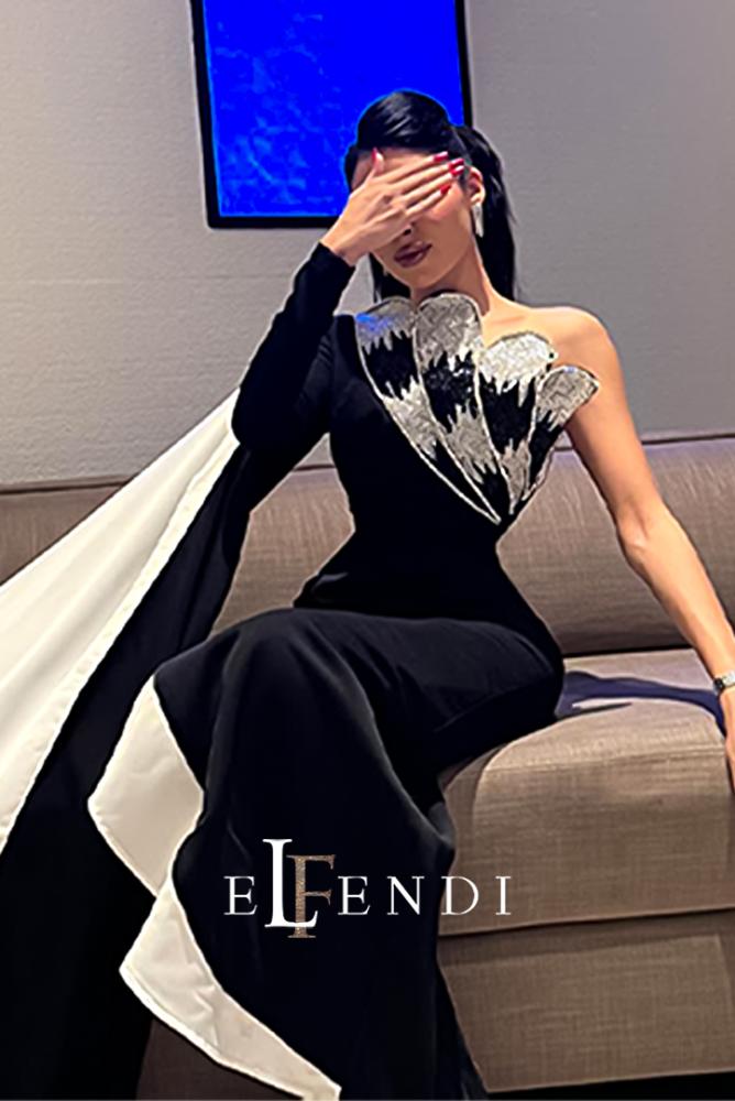 يتميز التصميم بقَصّة وان شولدر (One-Shoulder) مدموجة بأكمام طويلة، مع تطريز بارز على الصدر بتفاصيل ذهبية تشبه أجنحة ريشية تمنح الفستان لمسة درامية وجذابة. التنورة الضيقة بقَصّة مستقيمة تبرز القوام برقي، مع إضافة شال شفاف ينسدل من الخلف ليكمل الفخامة.