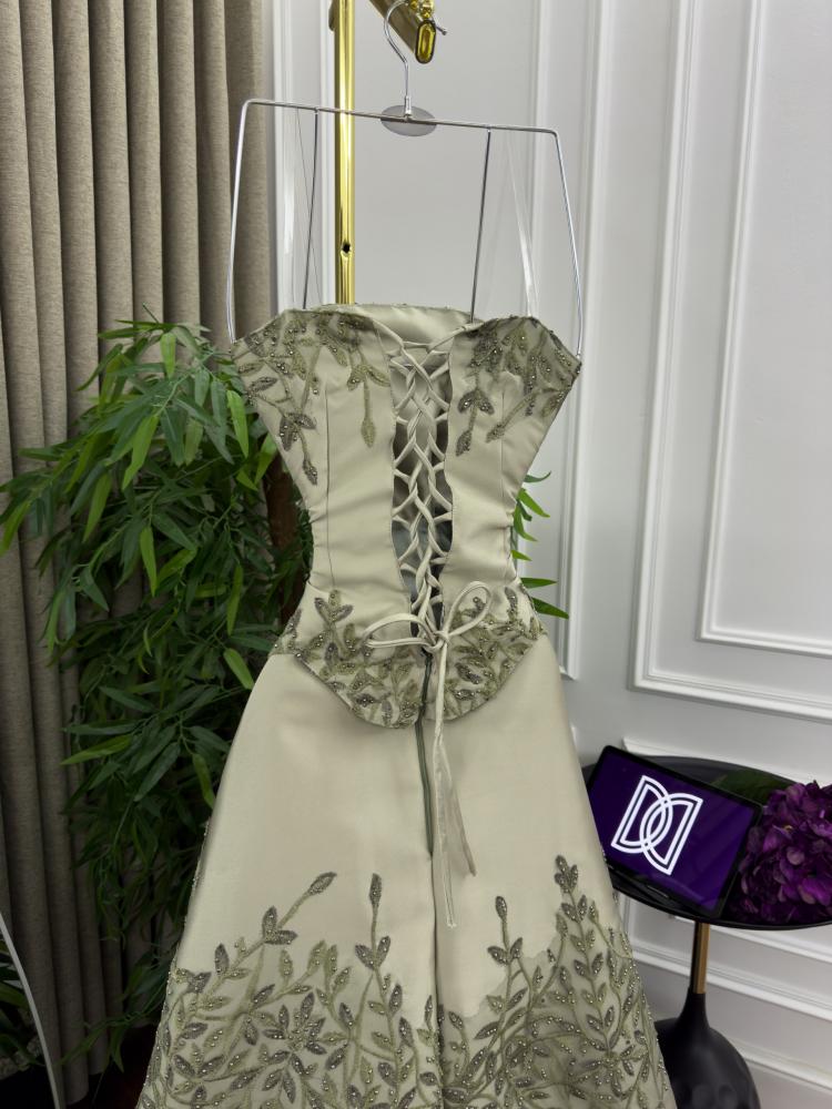 الجزء العلوي مطرّز بالكامل بتقنية الكمبيوتر، مرصّع بفصوص خضراء لامعة، تعكس الإضاءة بكل هدوء.