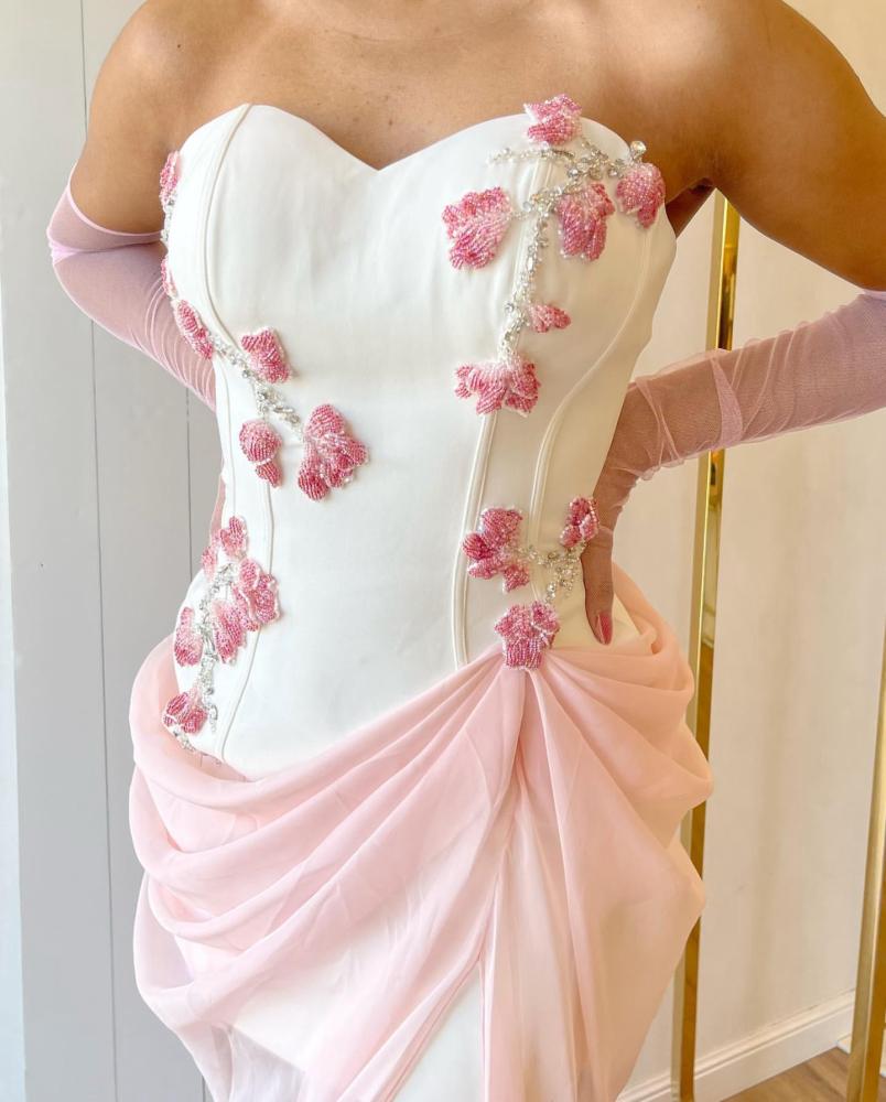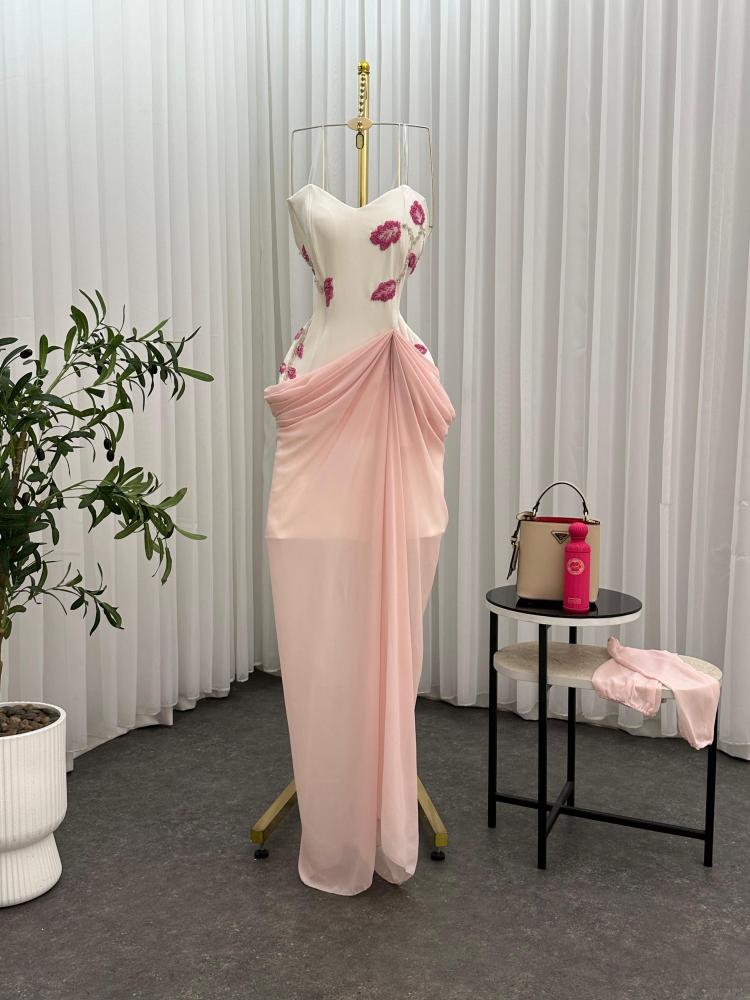 الجزء العلوي يجي بشيفون ناعم وتطريز يدوي متقن، يعطي لمسة فخمة بدون ما يكون مبالغ.