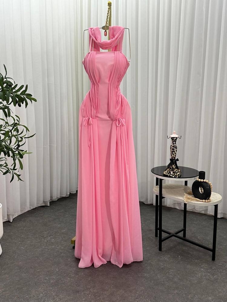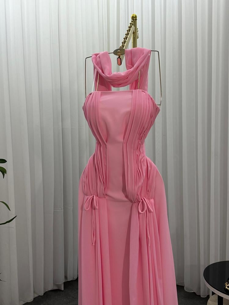 تصميم أنيق من قماش الجورجيت البليسيه (Georgette Plissé) بخطوط انسيابية تعانق الجسم وتبرز الخصر بأسلوب راقي. قصة الكورسيه الناعمة مع تنورة منسدلة تمنح الفستان إطلالة ملكية مليئة بالجاذبية.