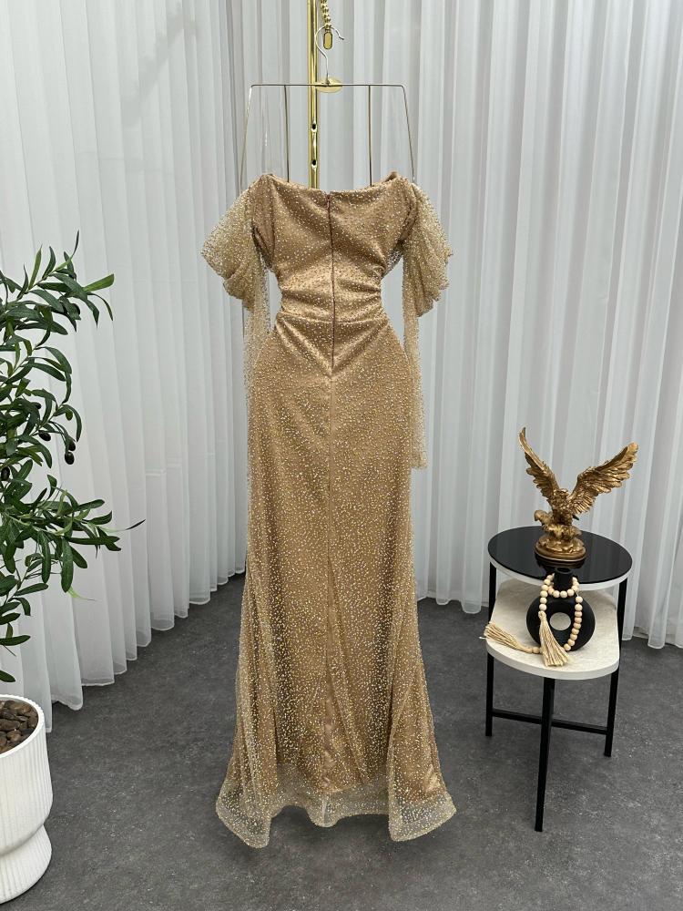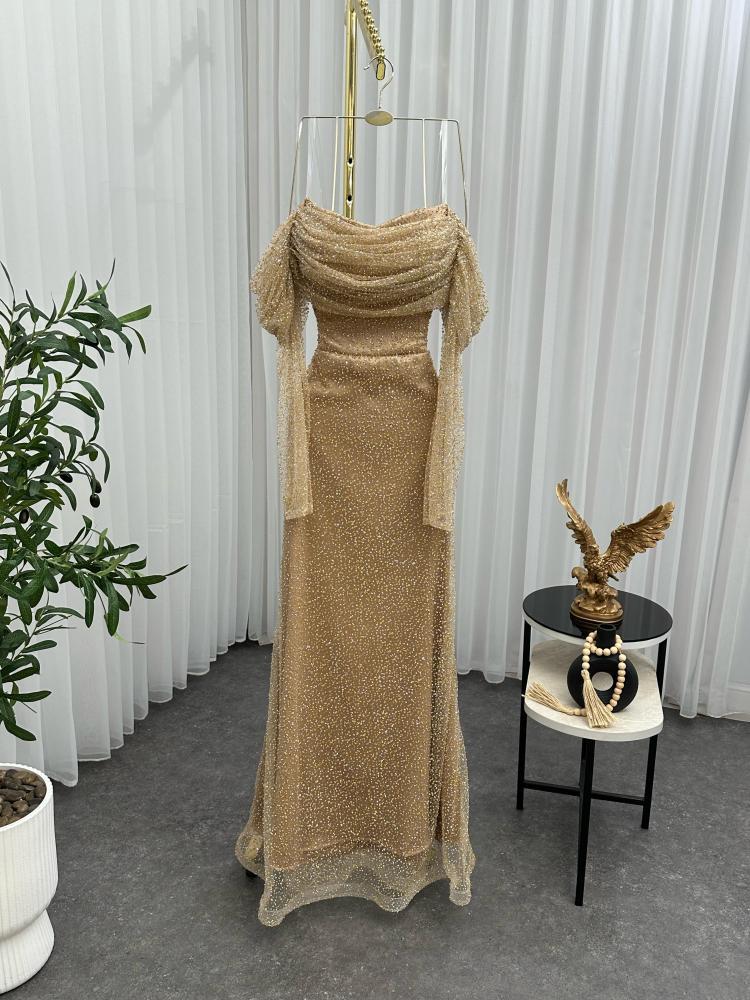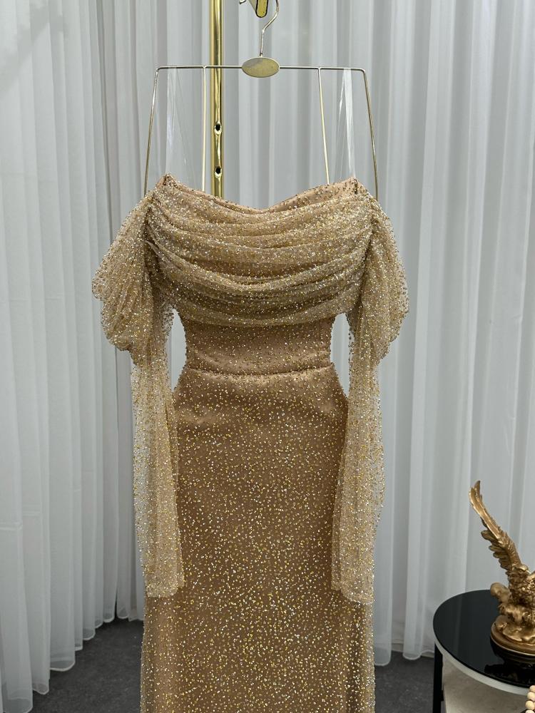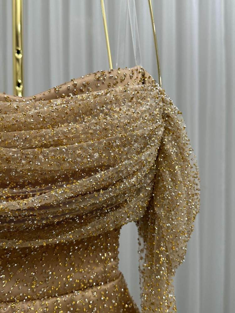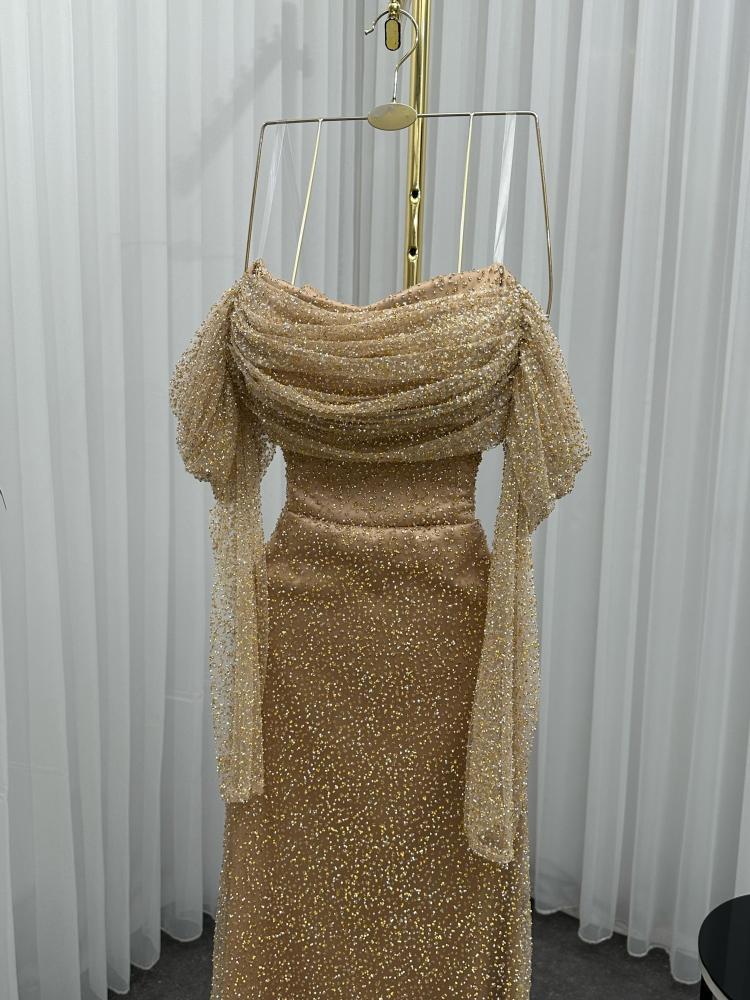 فستان سهرة طويل، مشغول بترتر ذهبي فاخر يعكس الإضاءة بكل زاوية، ويحتضن الجسم بقصة تبرز أنوثتك بثقة وأناقة.