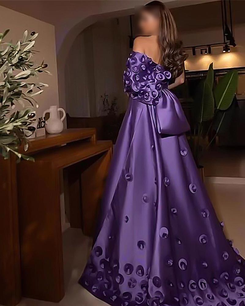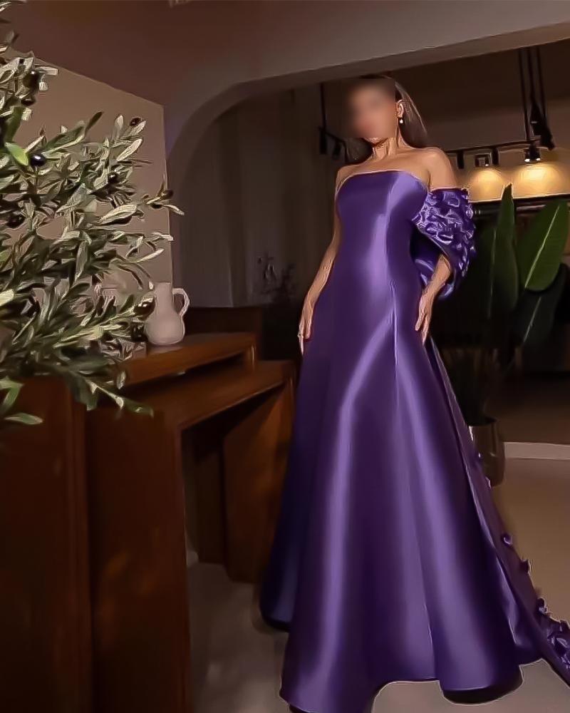 🎀 وصف التصميمقصّة أوف شولدر (Off-Shoulder) أنيقة تبرز الرقبة والكتفين بجاذبية، مع تصميم منحوت ينساب على الجسم بانسيابية راقية. الذيل الطويل المتدرج يضفي حركة ساحرة مع كل خطوة.
