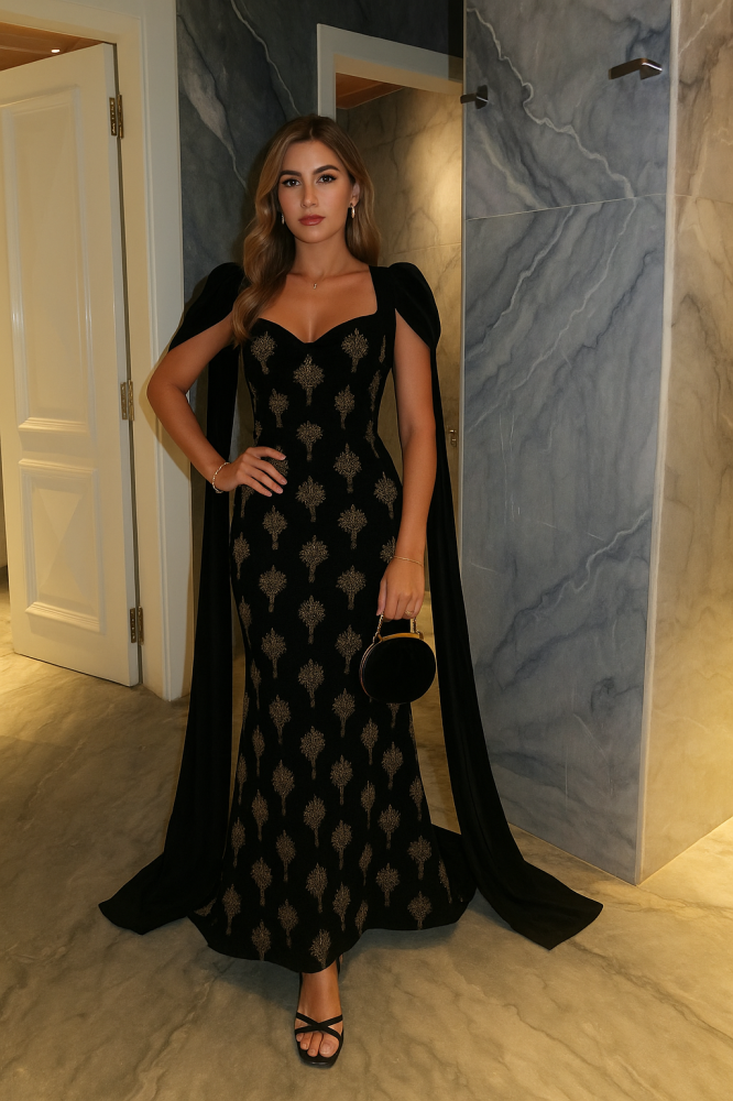 قصّة ضيقة تبرز الخصر، وتنسدل على الأرض بذيل خفيف، مع ياقة مفتوحة تُبرز منطقة الكتف والصدر بنعومة، ويغلفها درابيه جانبي فخم يخلق توازن بصري مثالي.