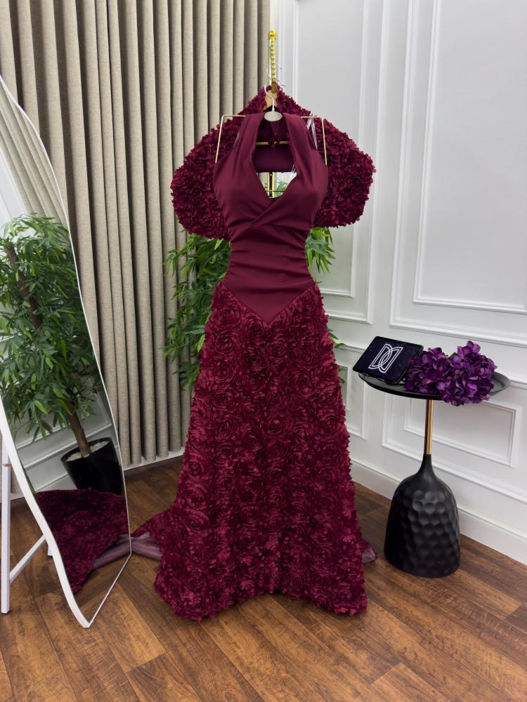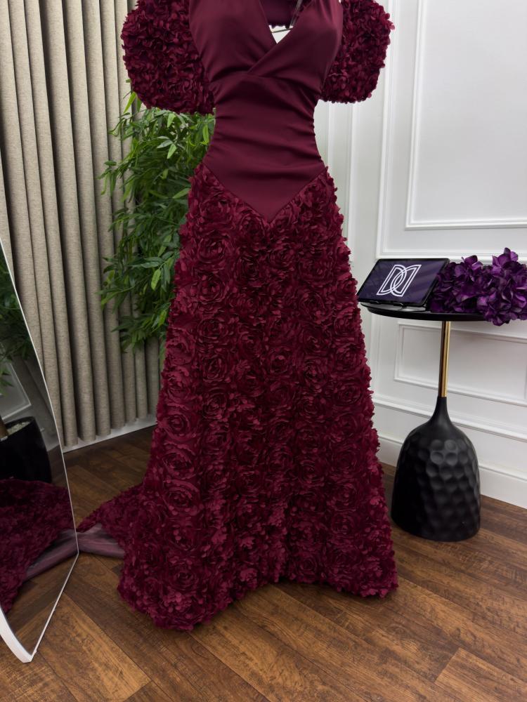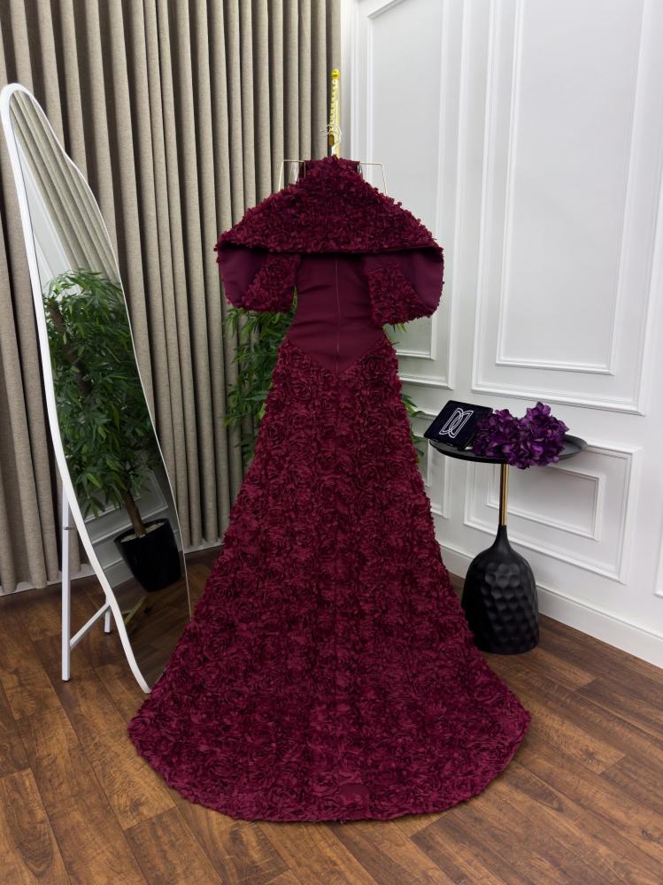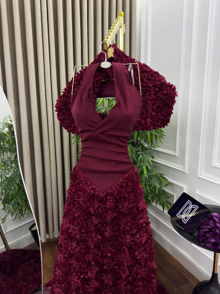 لإطلالة تعبّر عن ثقة وأناقة راقية، فستان عنابي مشجر يقدّم لكِ مزيج مثالي من الفخامة والأنوثة. تصميمه الفريد يخلي حضورك مختلف في أي مناسبة.