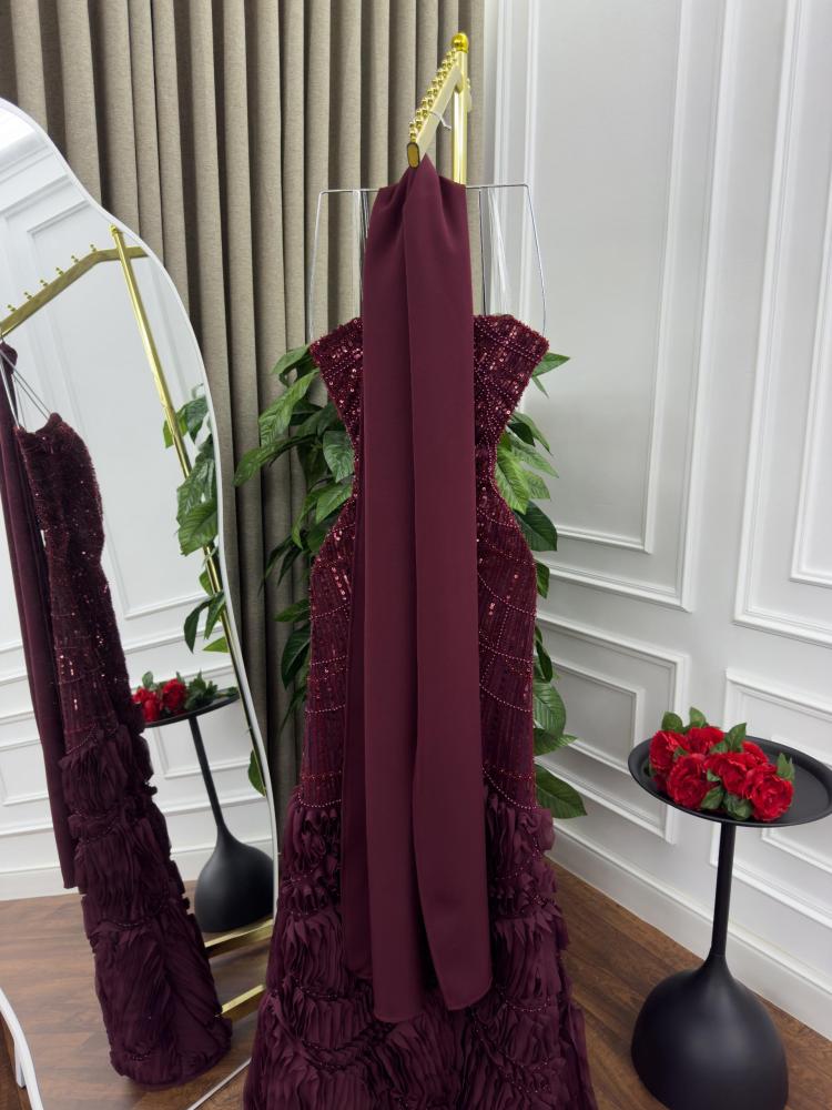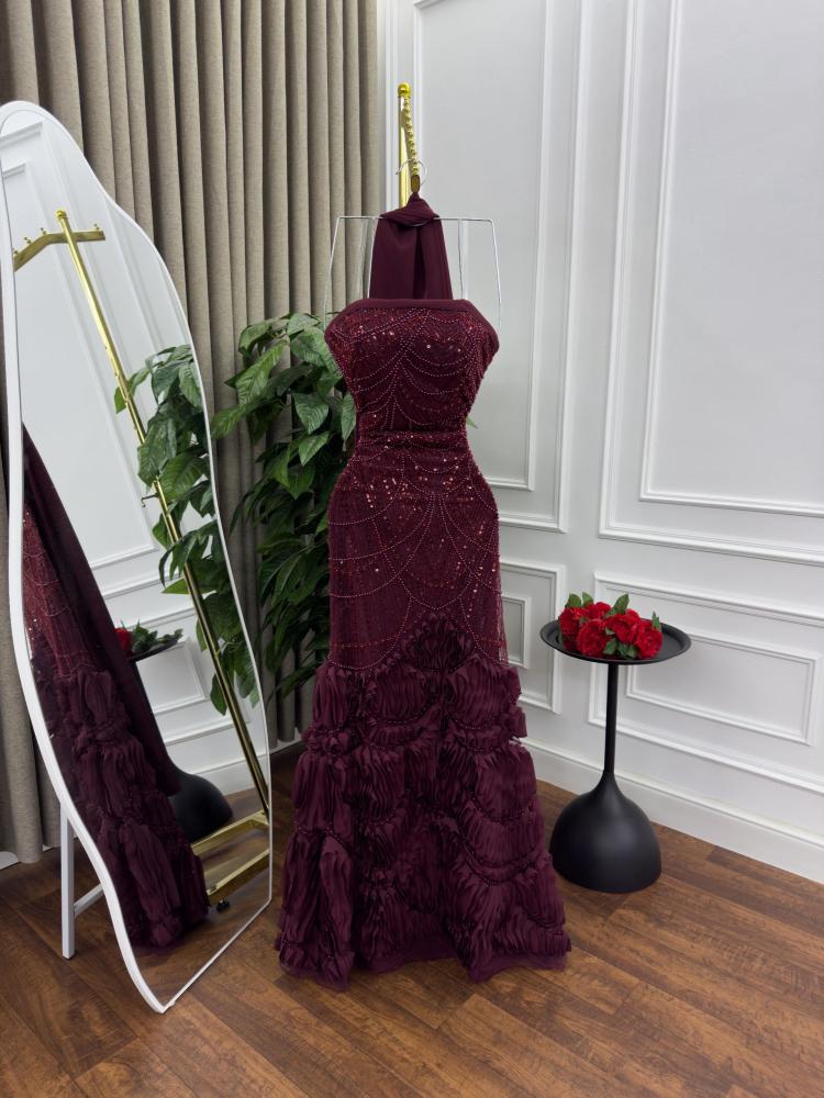 اختاري فستان سهرة عنابي مطرز بتفصيل سترابلس وشال فاخر، وخلي إطلالتك إيلفندي تكتب قصة حضورك في كل سهرة.